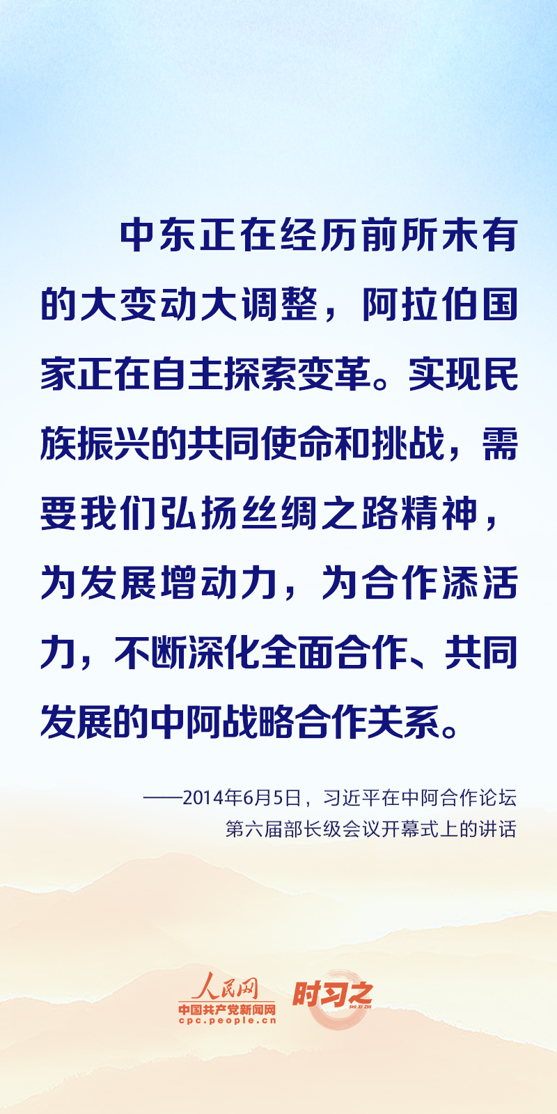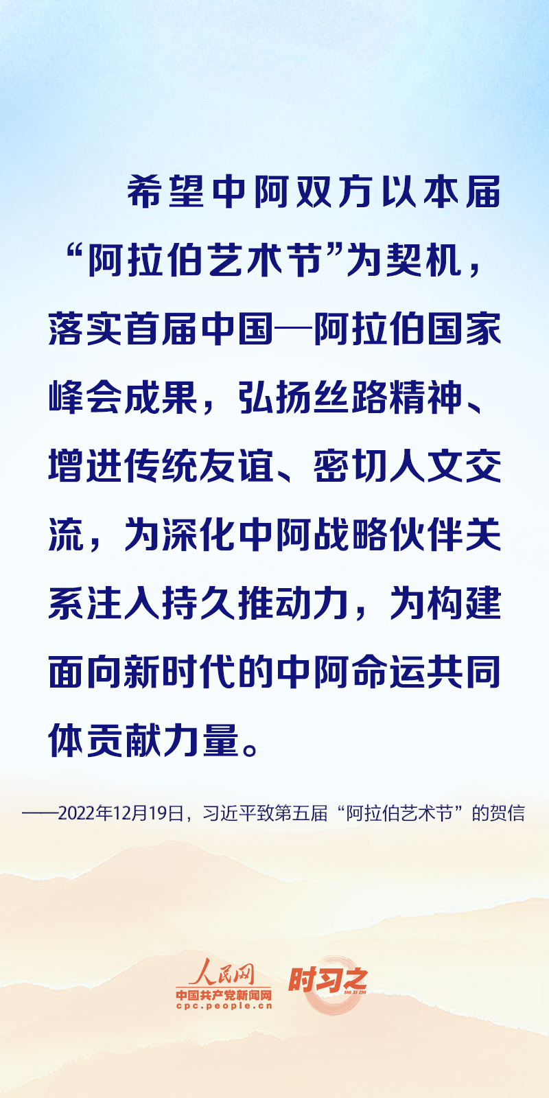 2022年12月19日,国家主席习近平向第五届“阿拉伯艺术节”致贺信。他再次提到“弘扬丝路精神”。