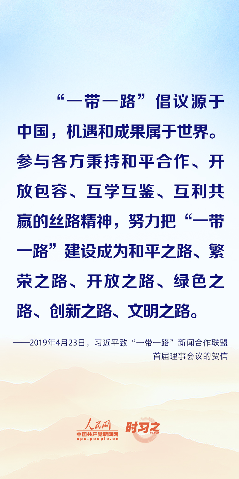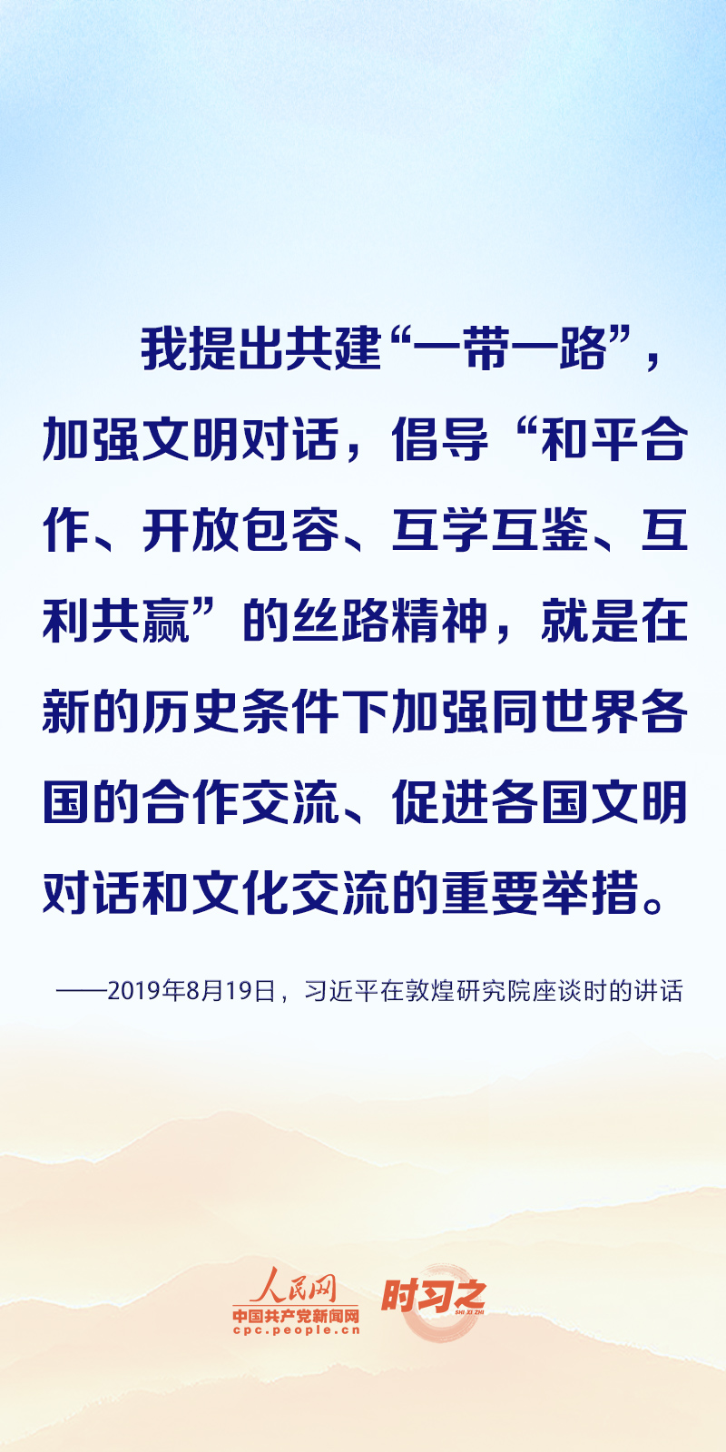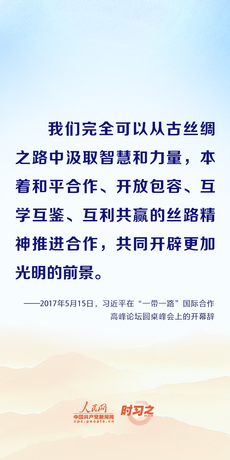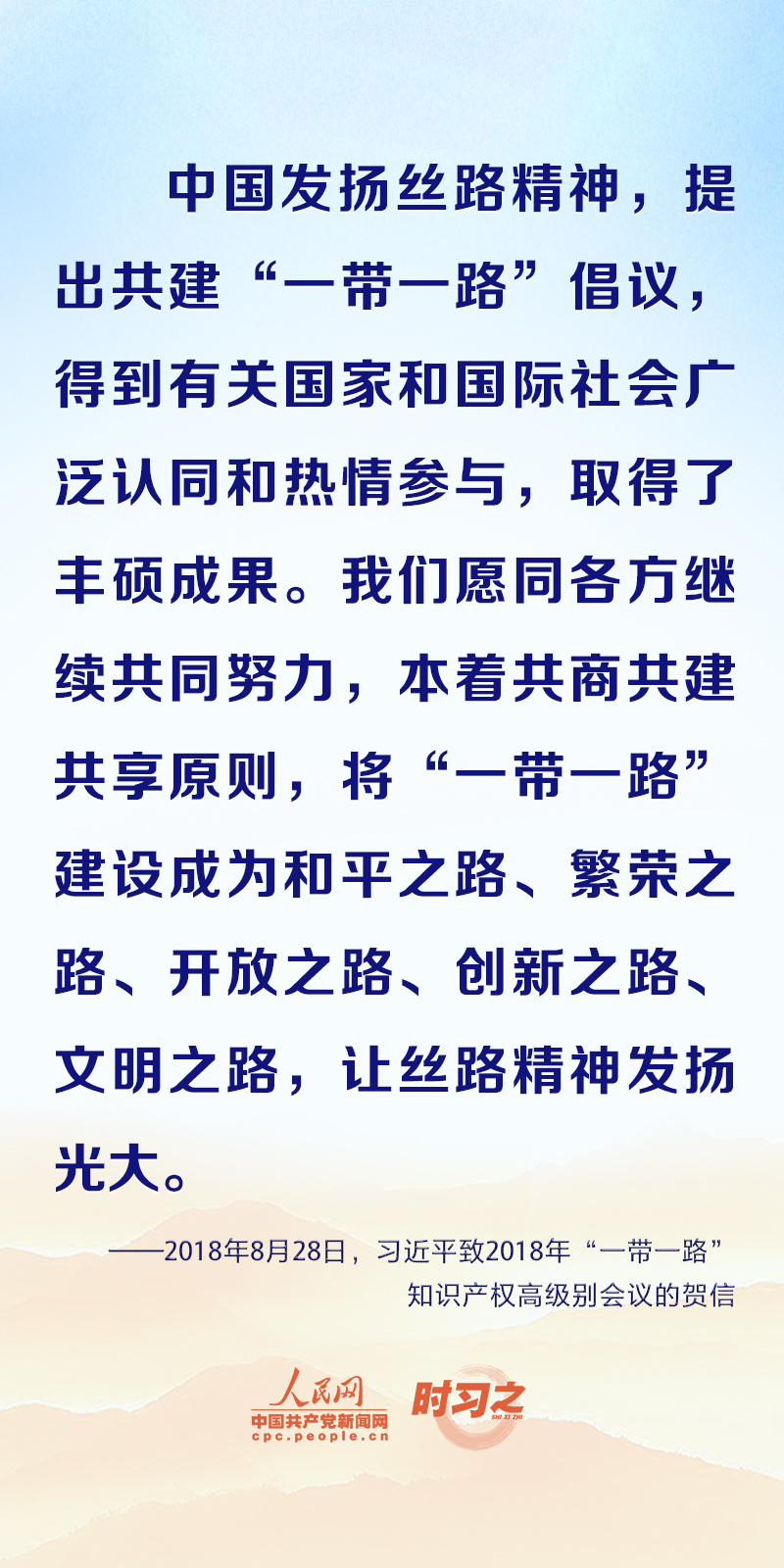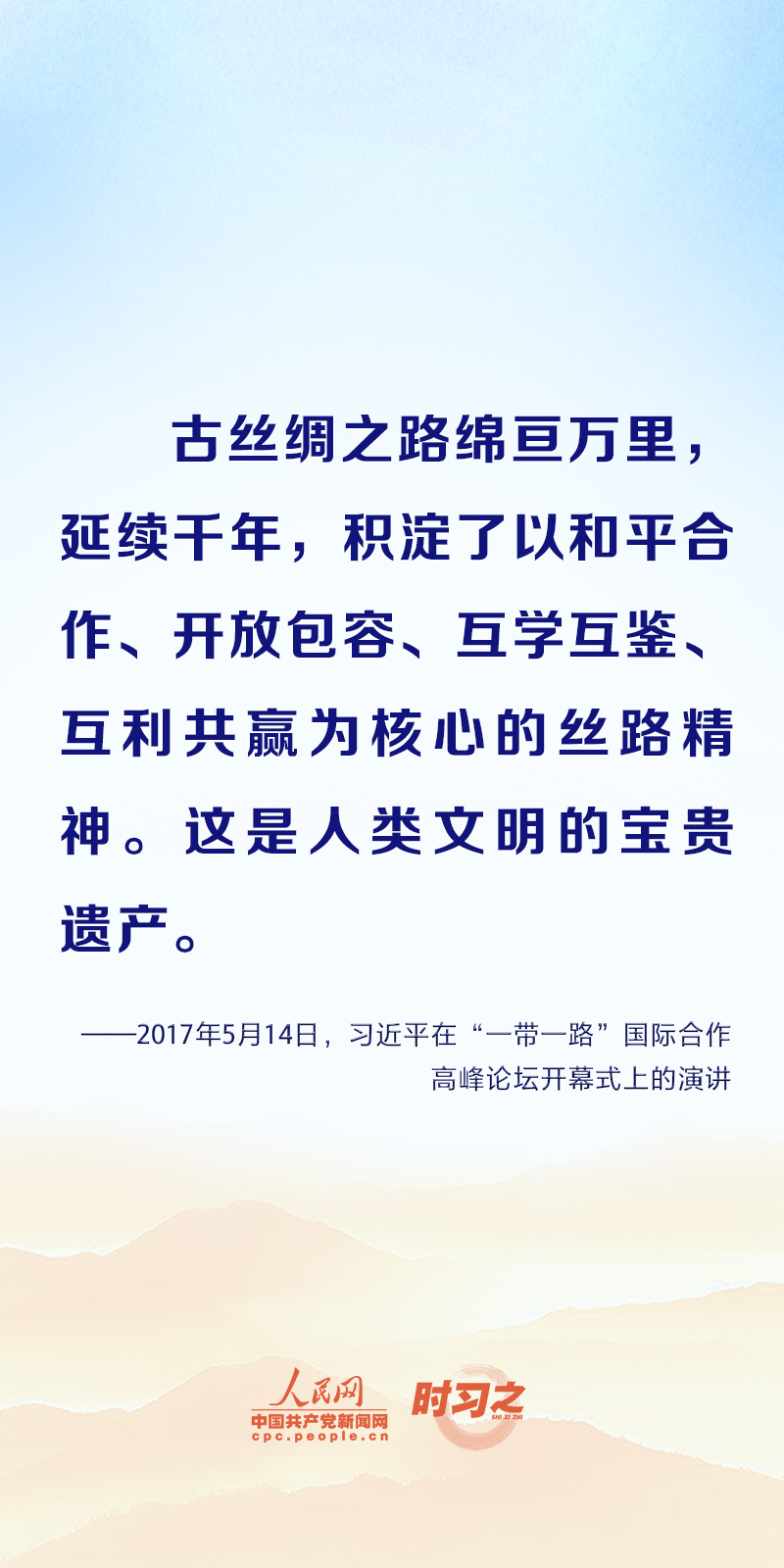 “古丝绸之路绵亘万里,延续千年,积淀了以和平合作、开放包容、互学互鉴、互利共赢为核心的丝路精神。这是人类文明的宝贵遗产。”习近平向多个场合致贺信或发表重要讲话时都阐释了丝路精神的时代内涵,一起学习领悟。