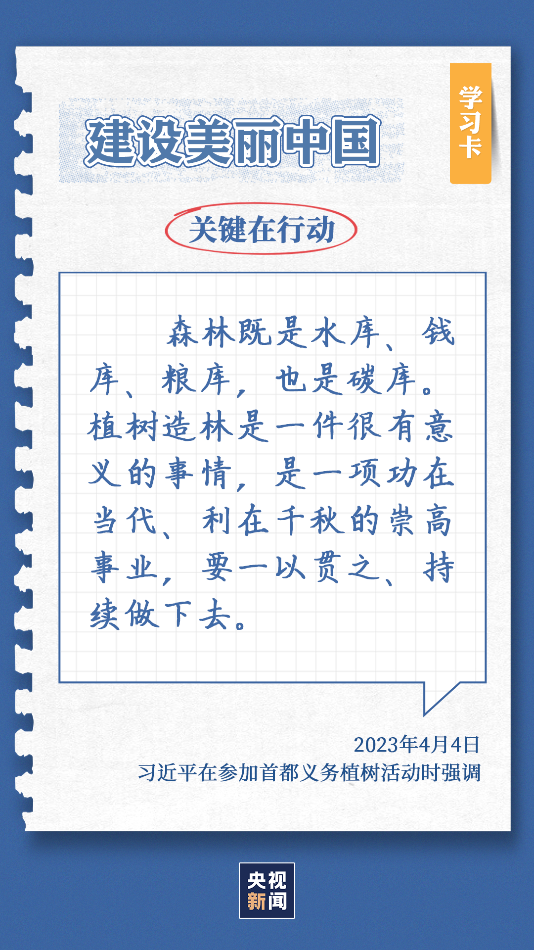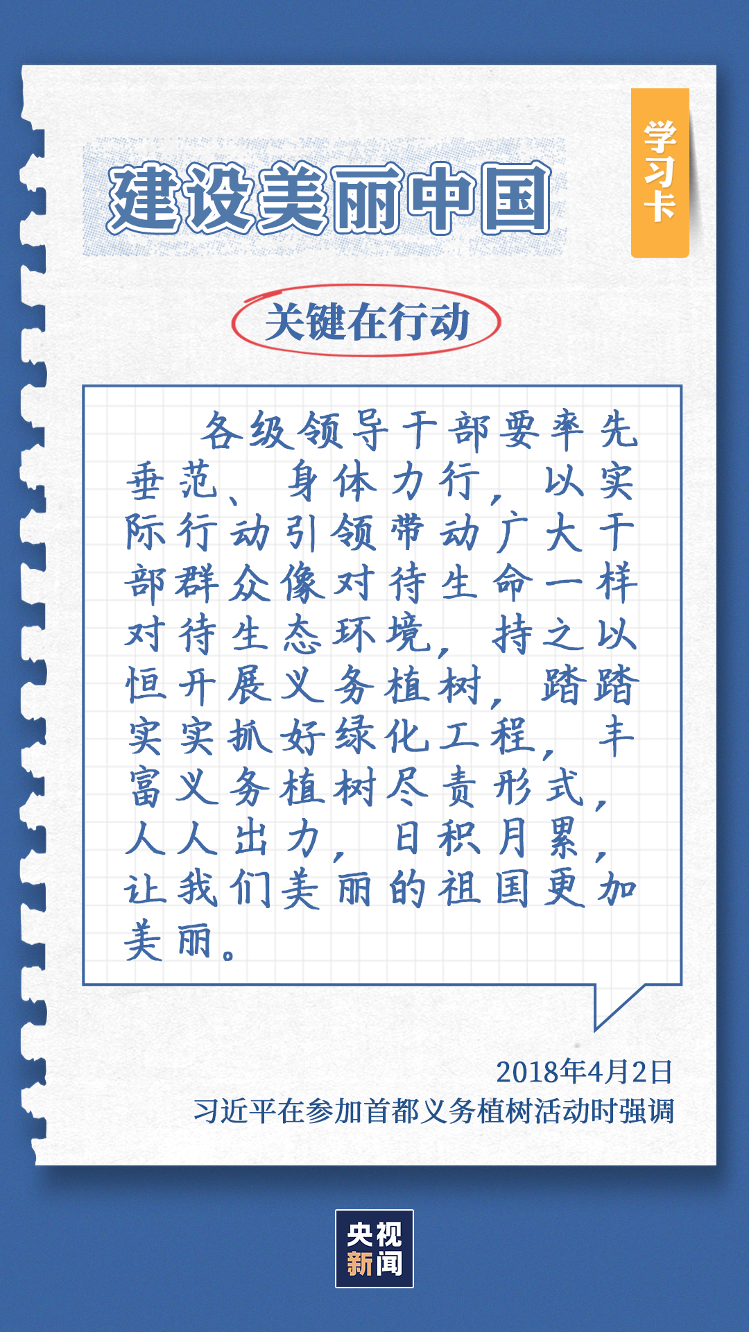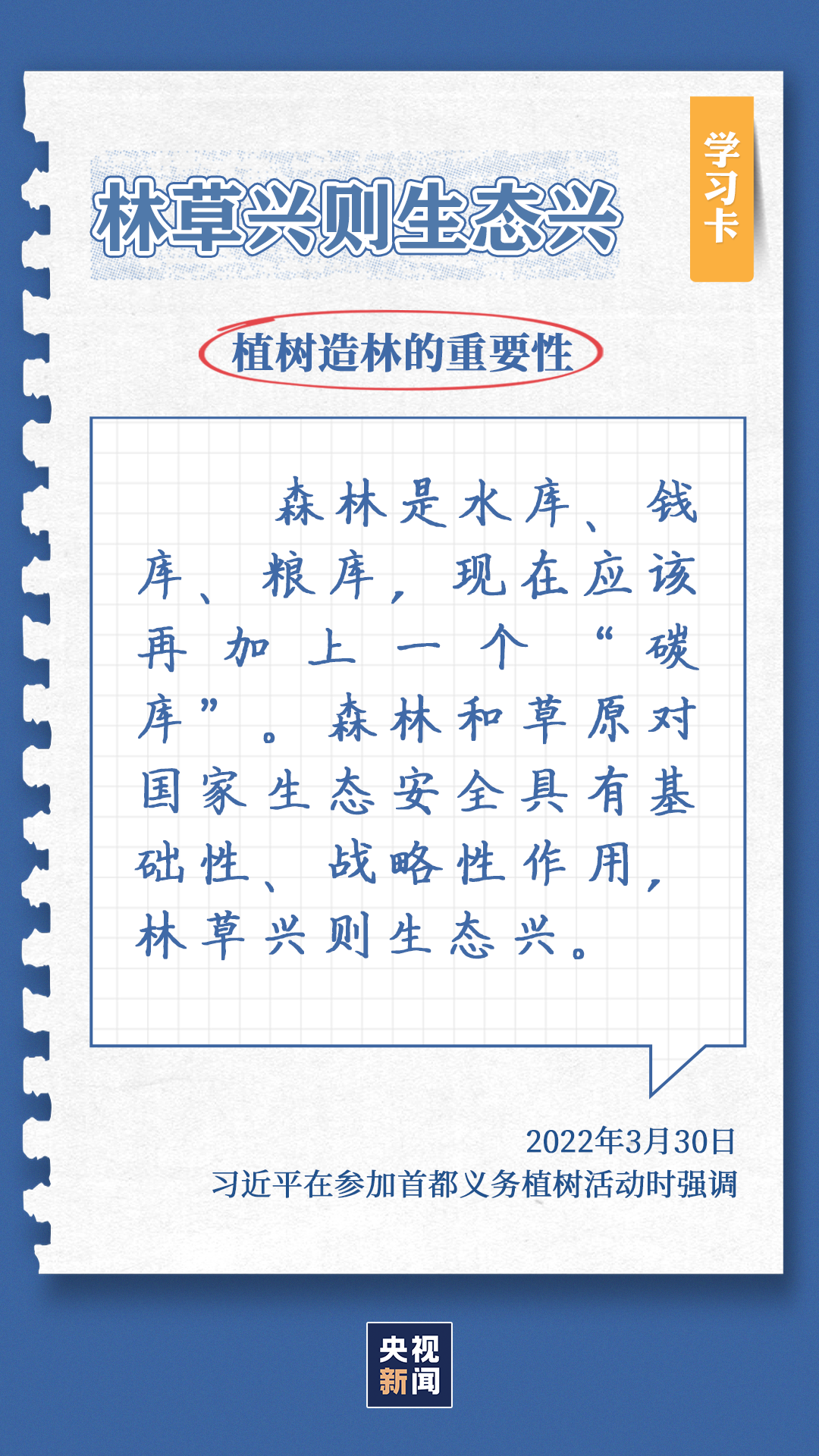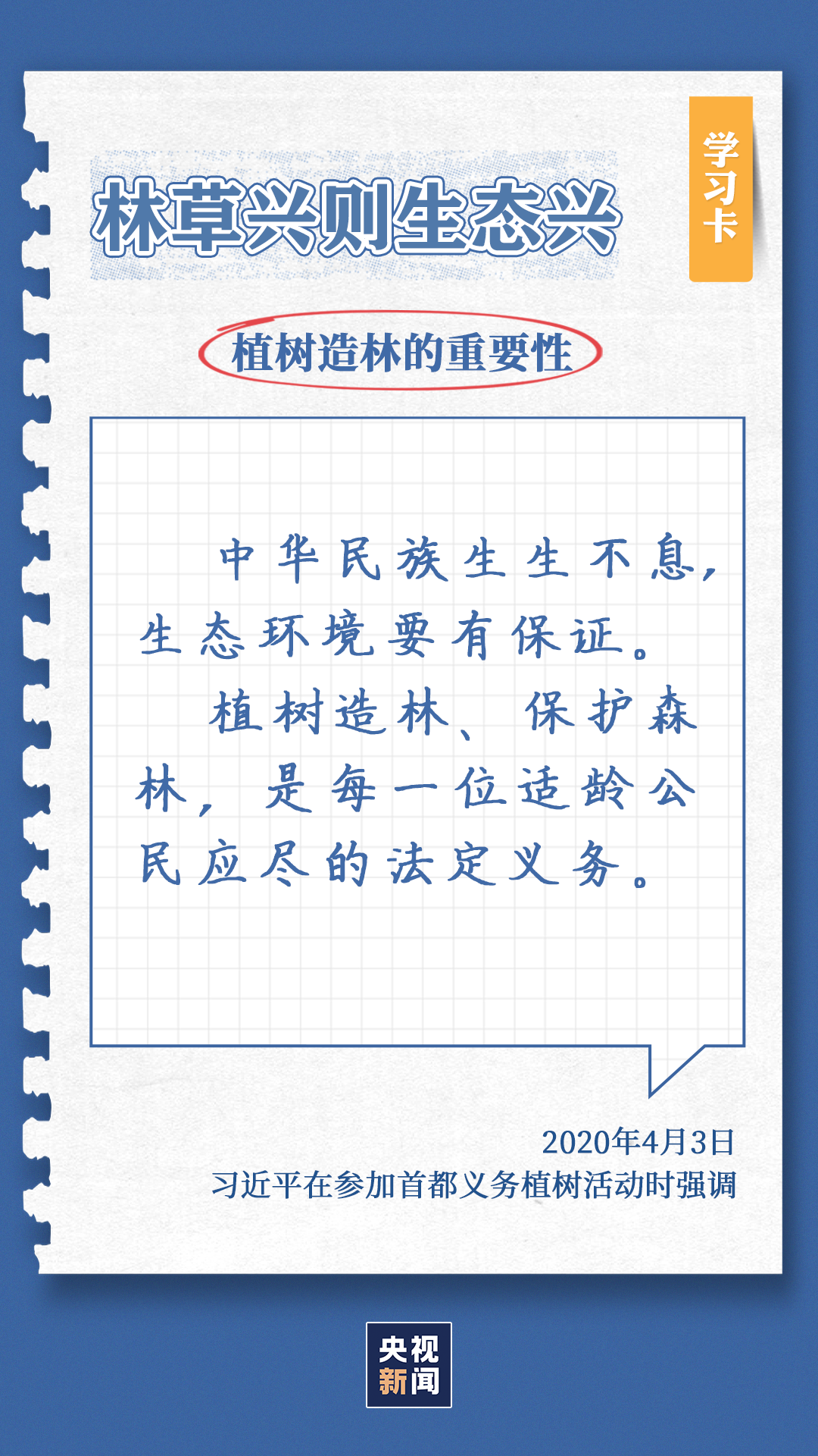 习近平总书记对生态环境的治理问题高度关注。党的十八大以来,每年三月末四月初,总书记都同干部群众一起参加首都义务植树,如今已是第11个年头。他不仅身体力行参与植树造林行动,更是多次强调森林是水库、钱库、粮库、碳库,一定要在爱绿护绿、保护生态上下大功夫。点击“学习卡”,一起学习↓