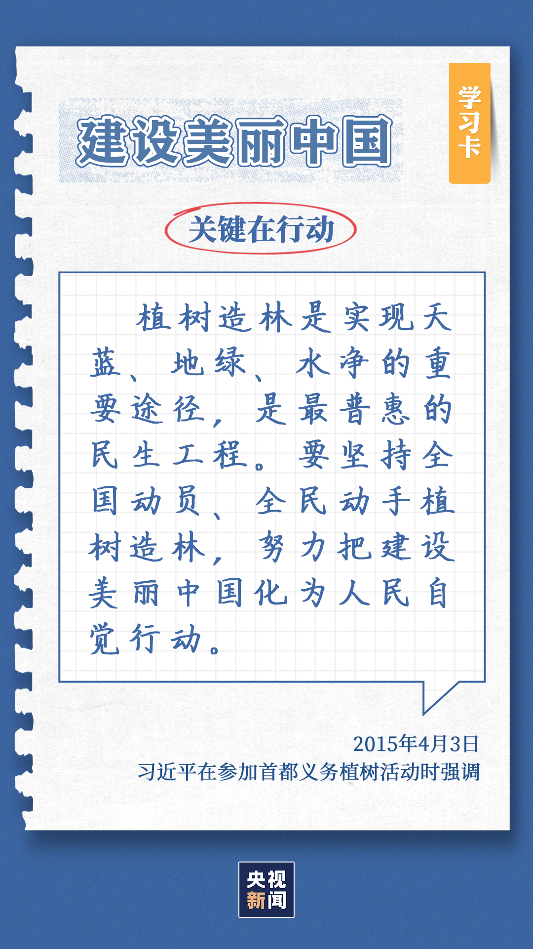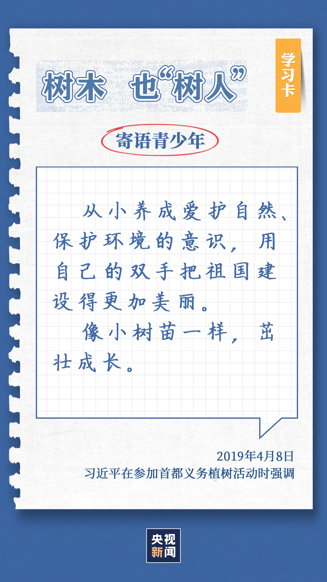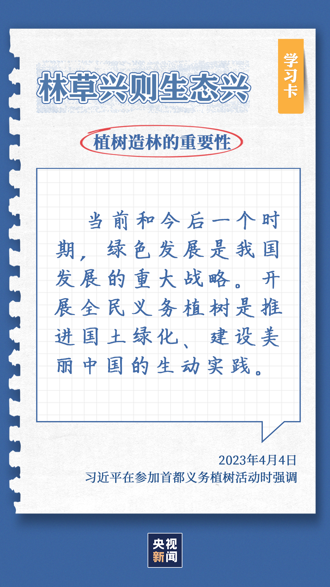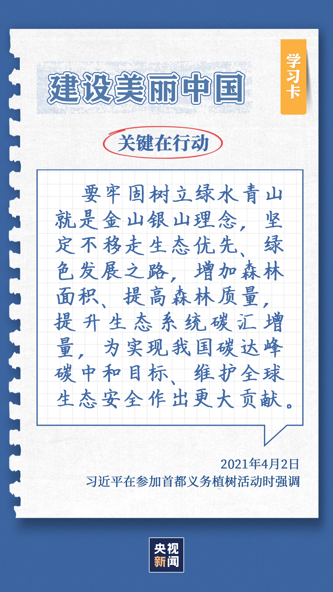 习近平总书记对生态环境的治理问题高度关注。党的十八大以来,每年三月末四月初,总书记都同干部群众一起参加首都义务植树,如今已是第11个年头。他不仅身体力行参与植树造林行动,更是多次强调森林是水库、钱库、粮库、碳库,一定要在爱绿护绿、保护生态上下大功夫。点击“学习卡”,一起学习↓
