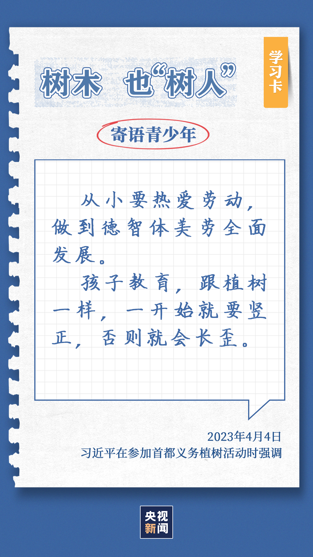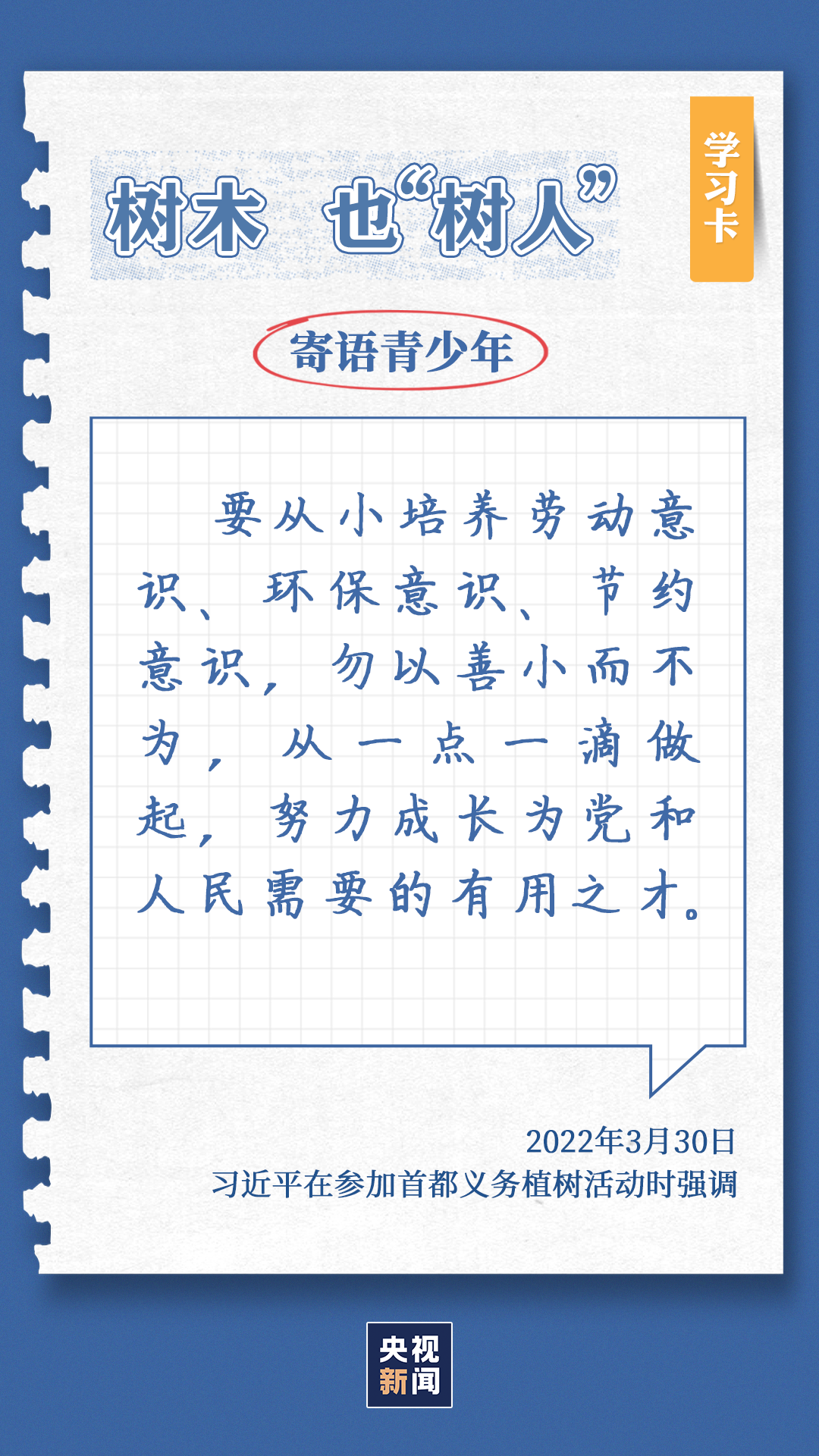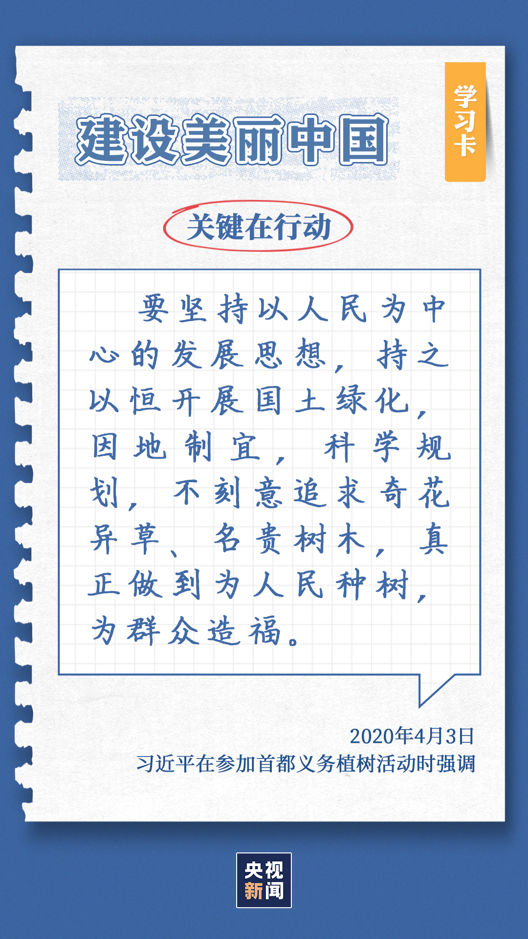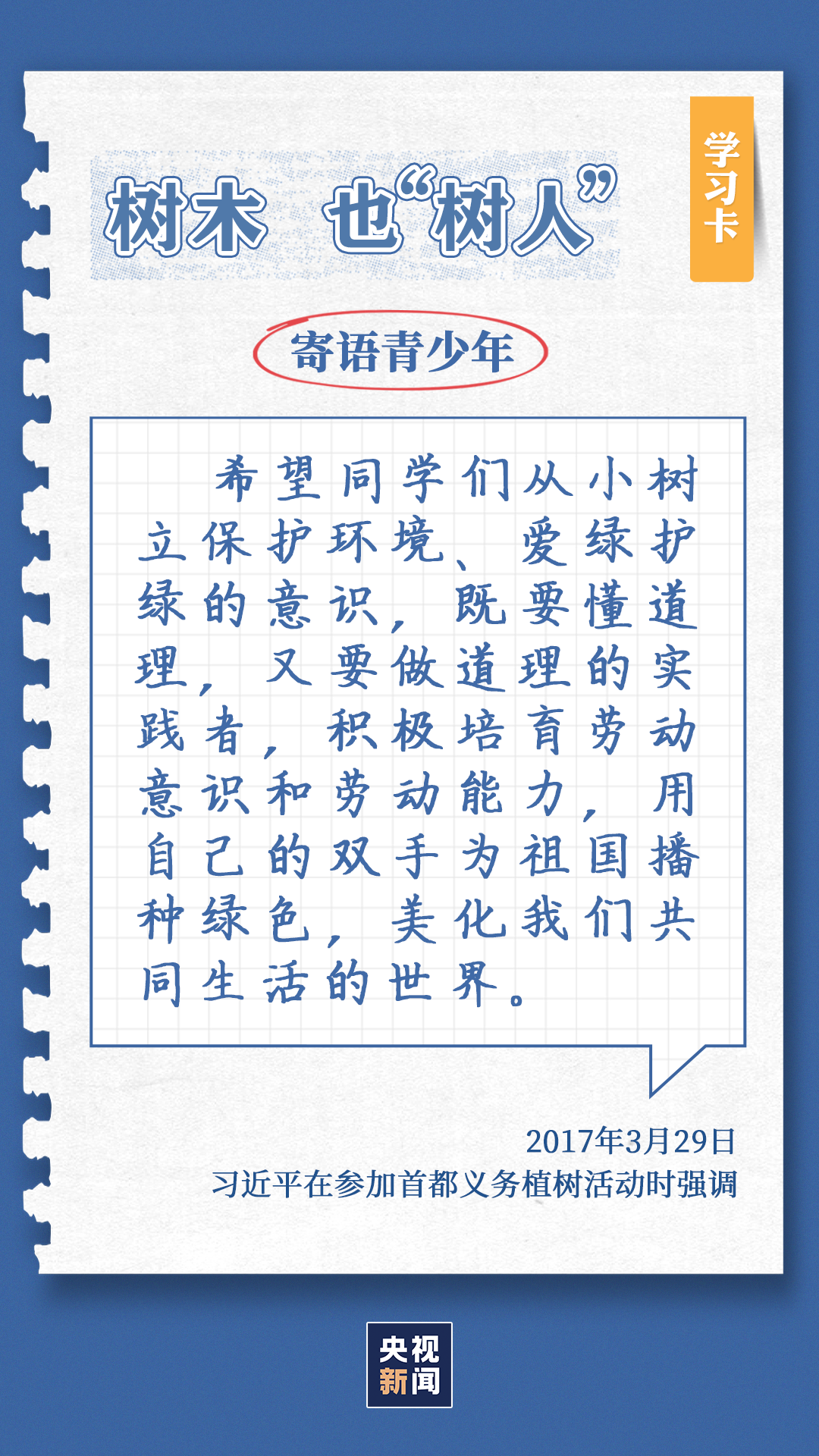 习近平总书记对生态环境的治理问题高度关注。党的十八大以来,每年三月末四月初,总书记都同干部群众一起参加首都义务植树,如今已是第11个年头。他不仅身体力行参与植树造林行动,更是多次强调森林是水库、钱库、粮库、碳库,一定要在爱绿护绿、保护生态上下大功夫。点击“学习卡”,一起学习↓