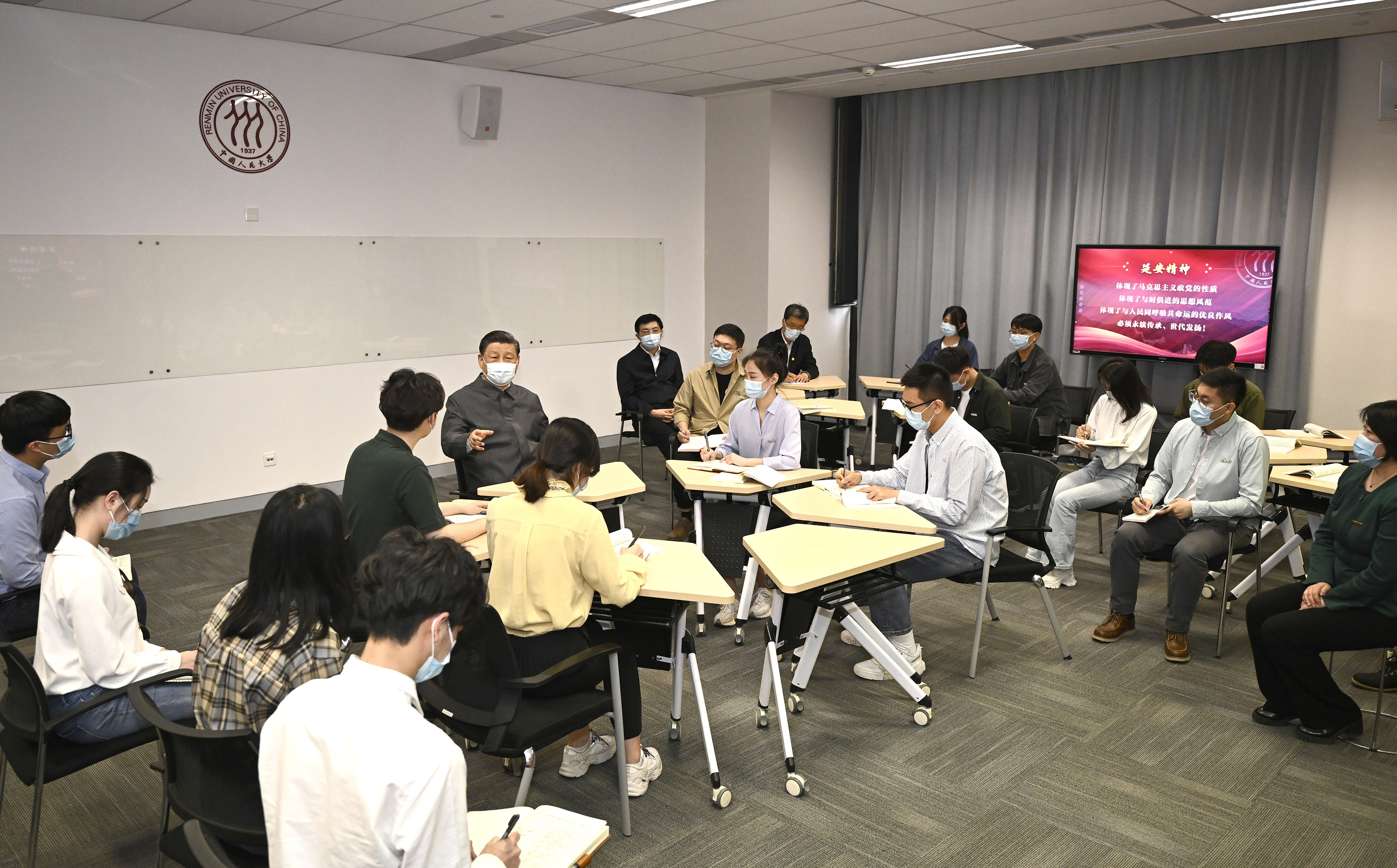 2022年4月25日上午,在五四青年节前夕,中共中央总书记、国家主席、中央军委主席习近平来到中国人民大学,先后走进思政课智慧教室、博物馆、图书馆,了解学校促进思政课教育改革创新、学校历史沿革、教学科研成果、加强文献古籍保护利用和促进理论研究成果转化应用等情况,并主持召开师生代表座谈会。新华社记者 燕雁 摄