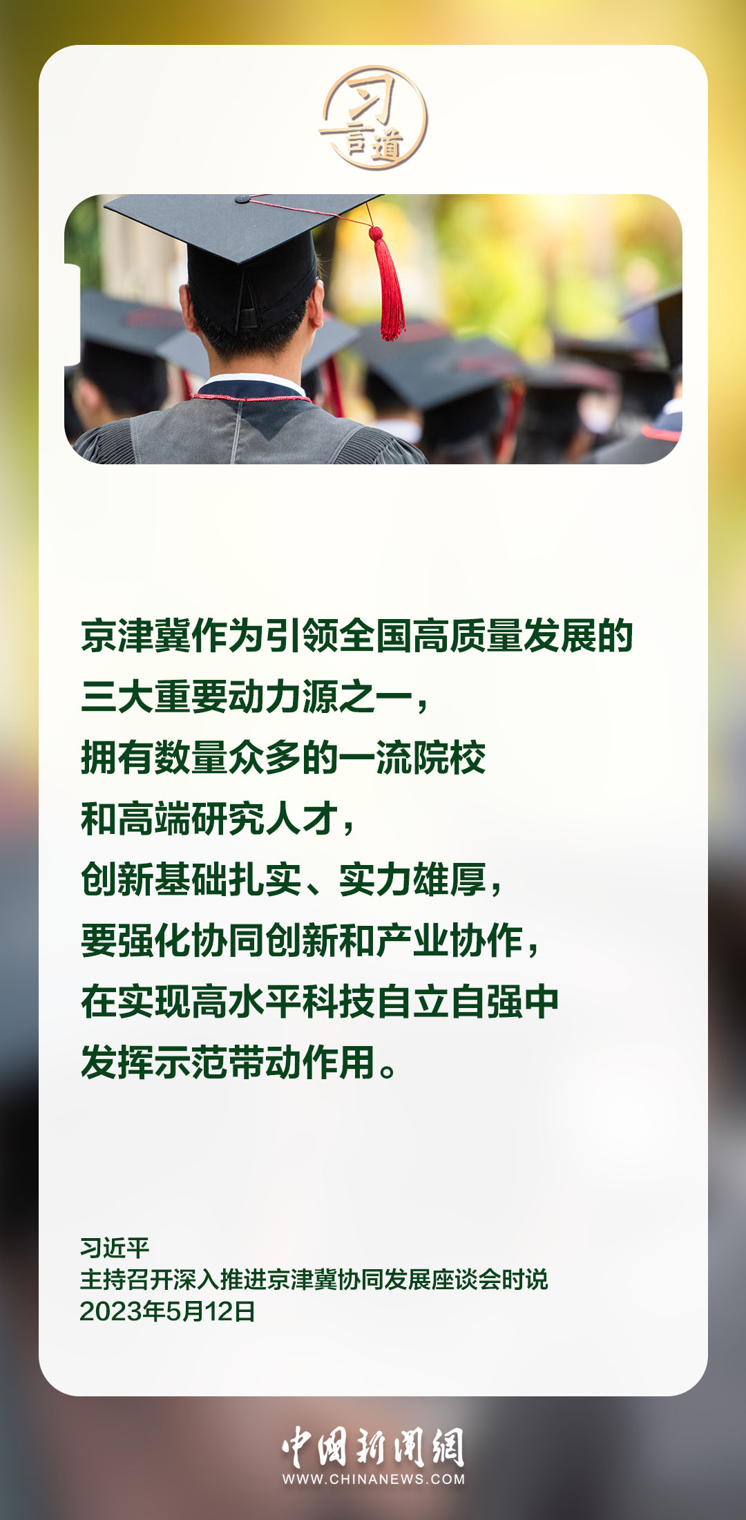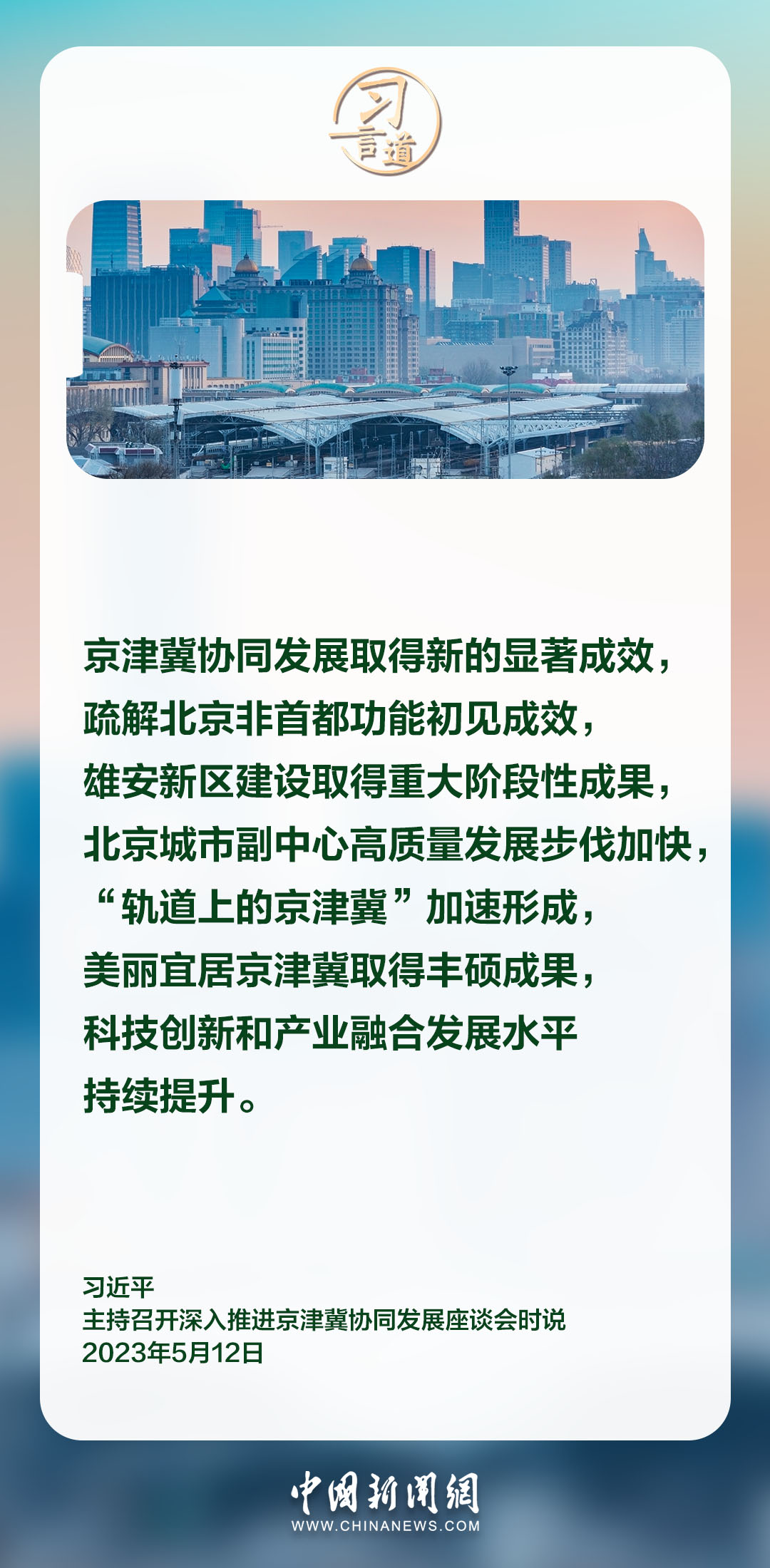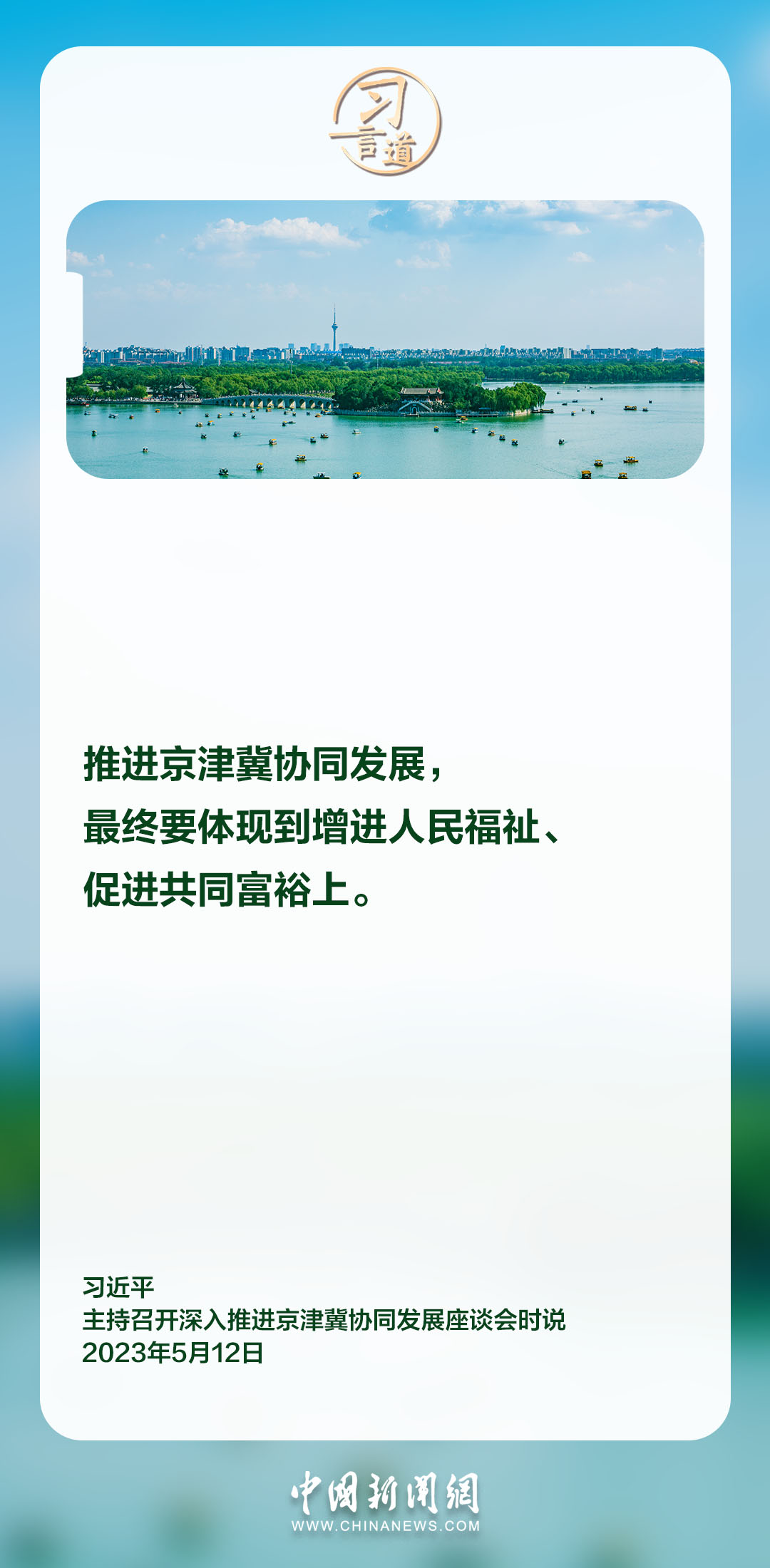 京津冀,我国经济最具活力、开放程度最高、创新能力最强的地区之一。习近平总书记在不同场合多次就京津冀协同发展作出重要指示,强调推进京津冀协同发展,最终要体现到增进人民福祉、促进共同富裕上。