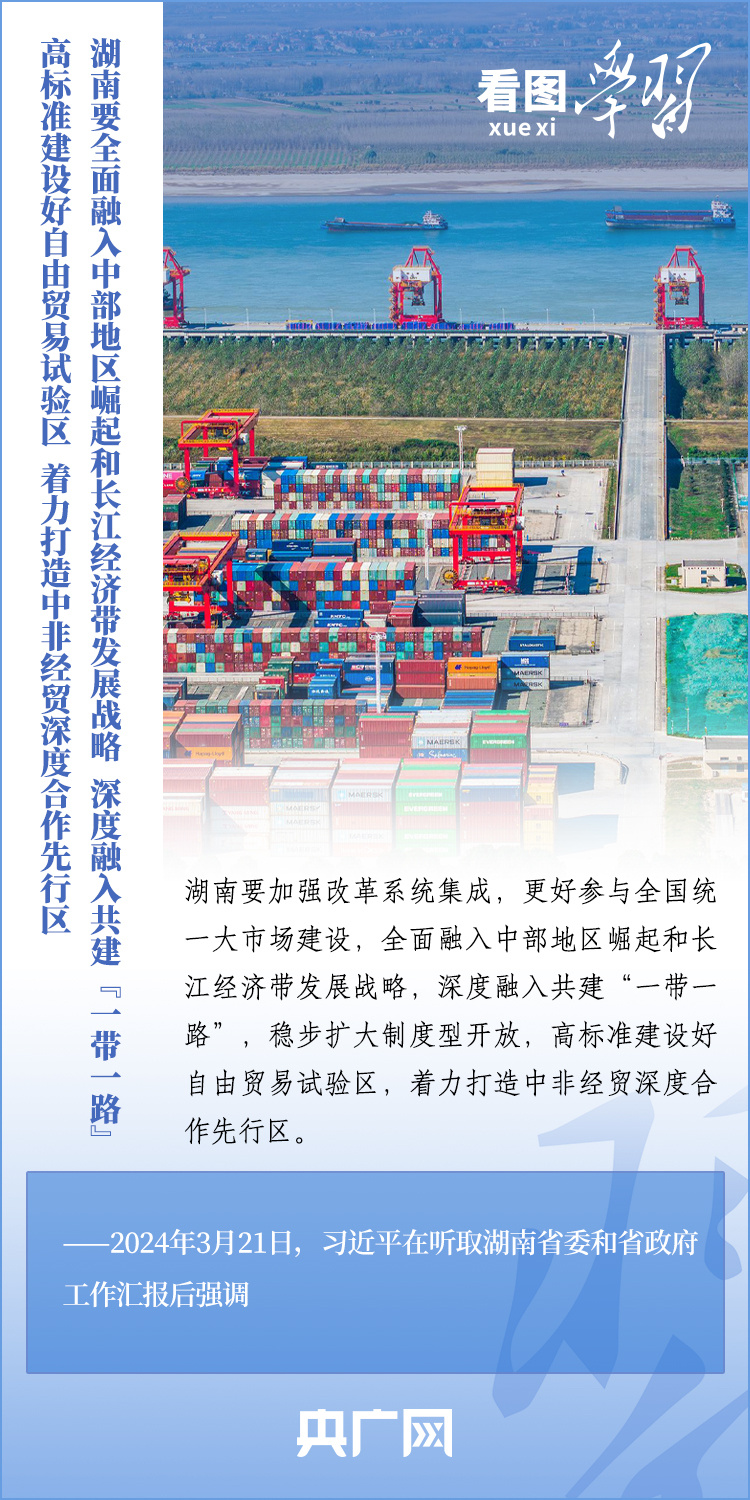 3月18日至21日,习近平总书记考察湖南长沙、常德等地,深入学校、企业、历史文化街区、乡村等进行调研。总书记强调,湖南要牢牢把握自身在构建新发展格局中的战略定位,坚持稳中求进工作总基调,坚持高质量发展不动摇,坚持改革创新、求真务实,在打造国家重要先进制造业高地、具有核心竞争力的科技创新高地、内陆地区改革开放高地上持续用力,在推动中部地区崛起和长江经济带发展中奋勇争先,奋力谱写中国式现代化湖南篇章。一起来学习!