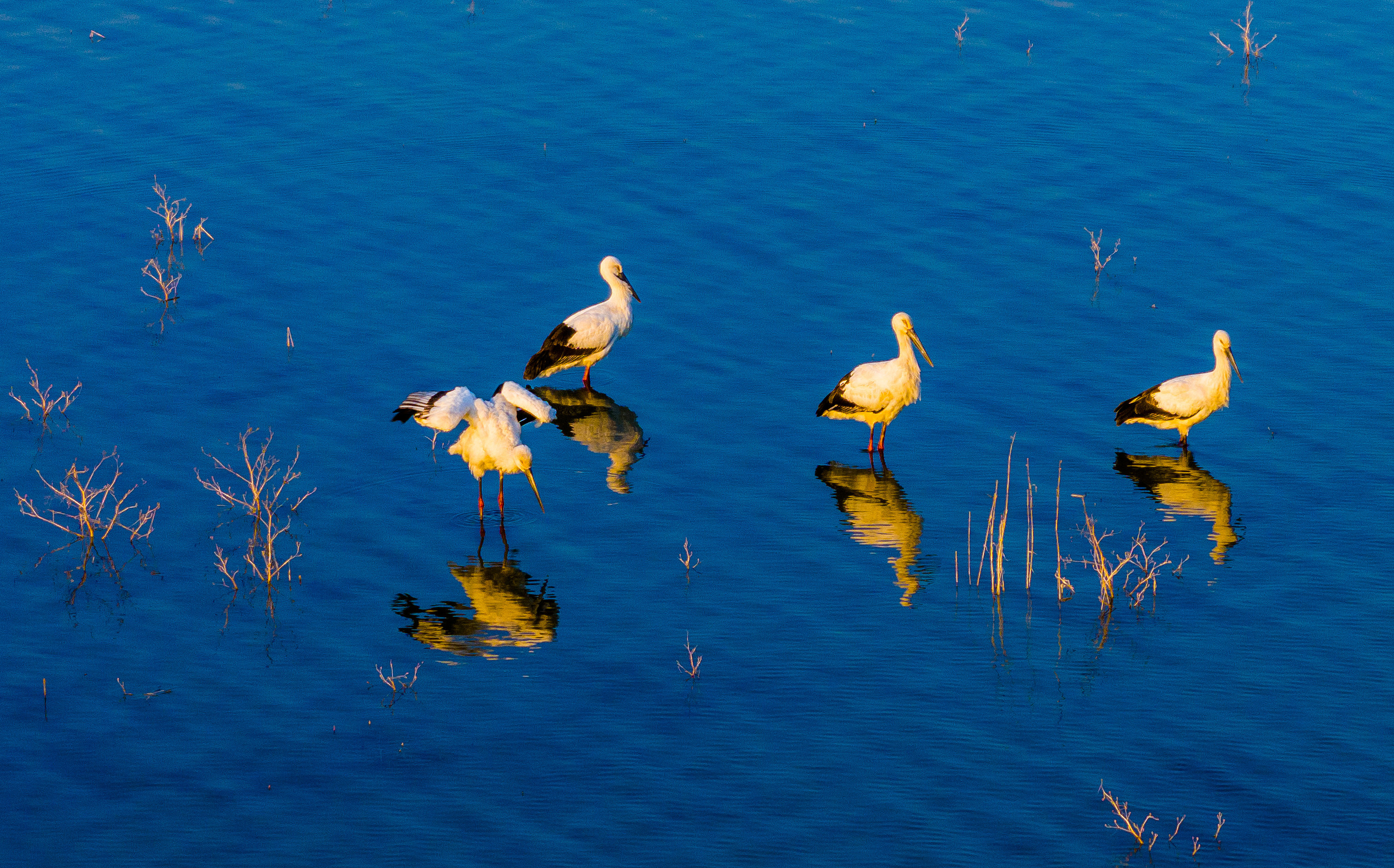 △2023年12月1日,安徽淮北,烈山区化家湖,4只迁徙的国宝级野生动物东方白鹳在休憩、觅食。
