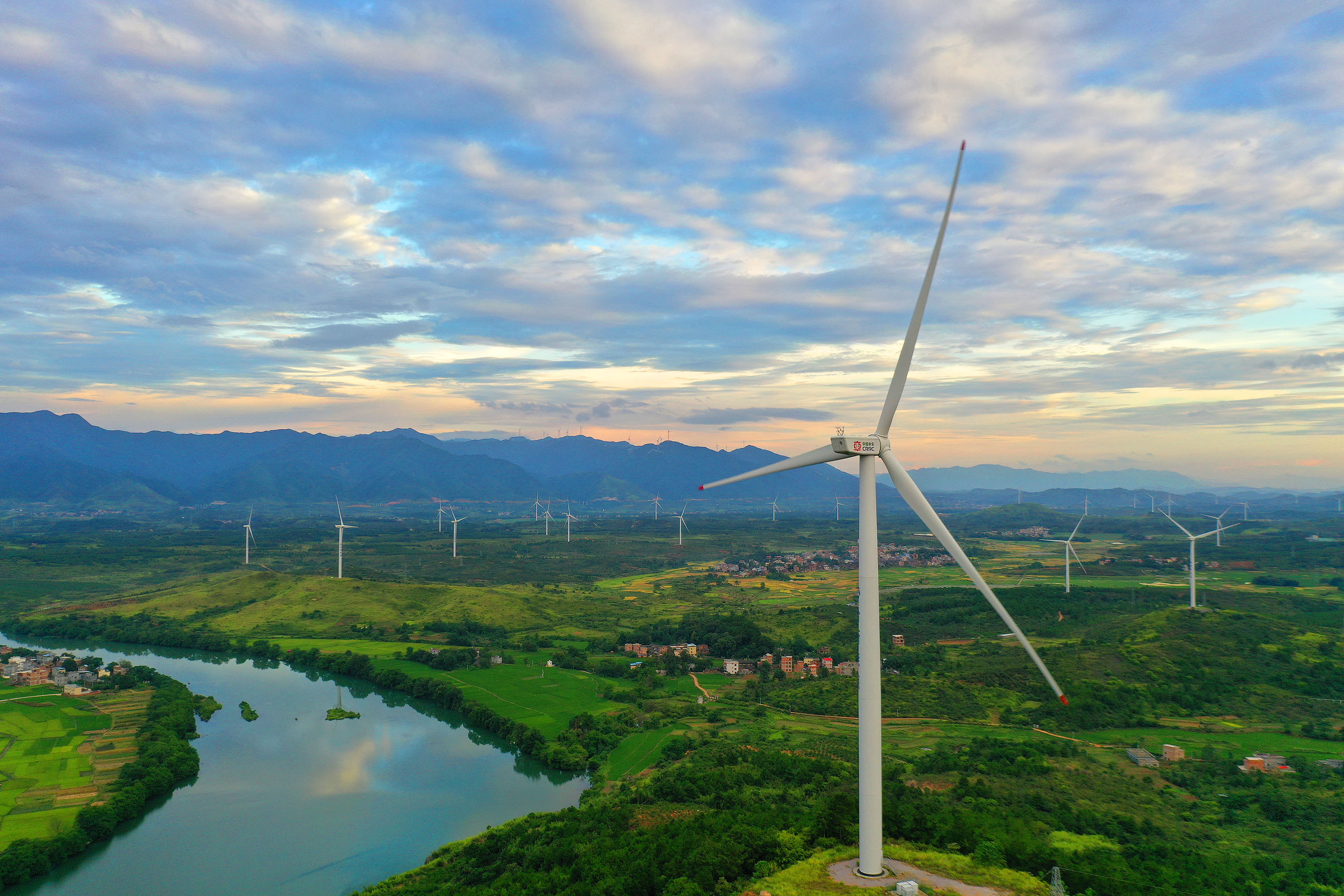 △湖南省永州市的风力发电风车与蓝天、绿水、田野交相辉映,构成一幅美丽的生态画卷。