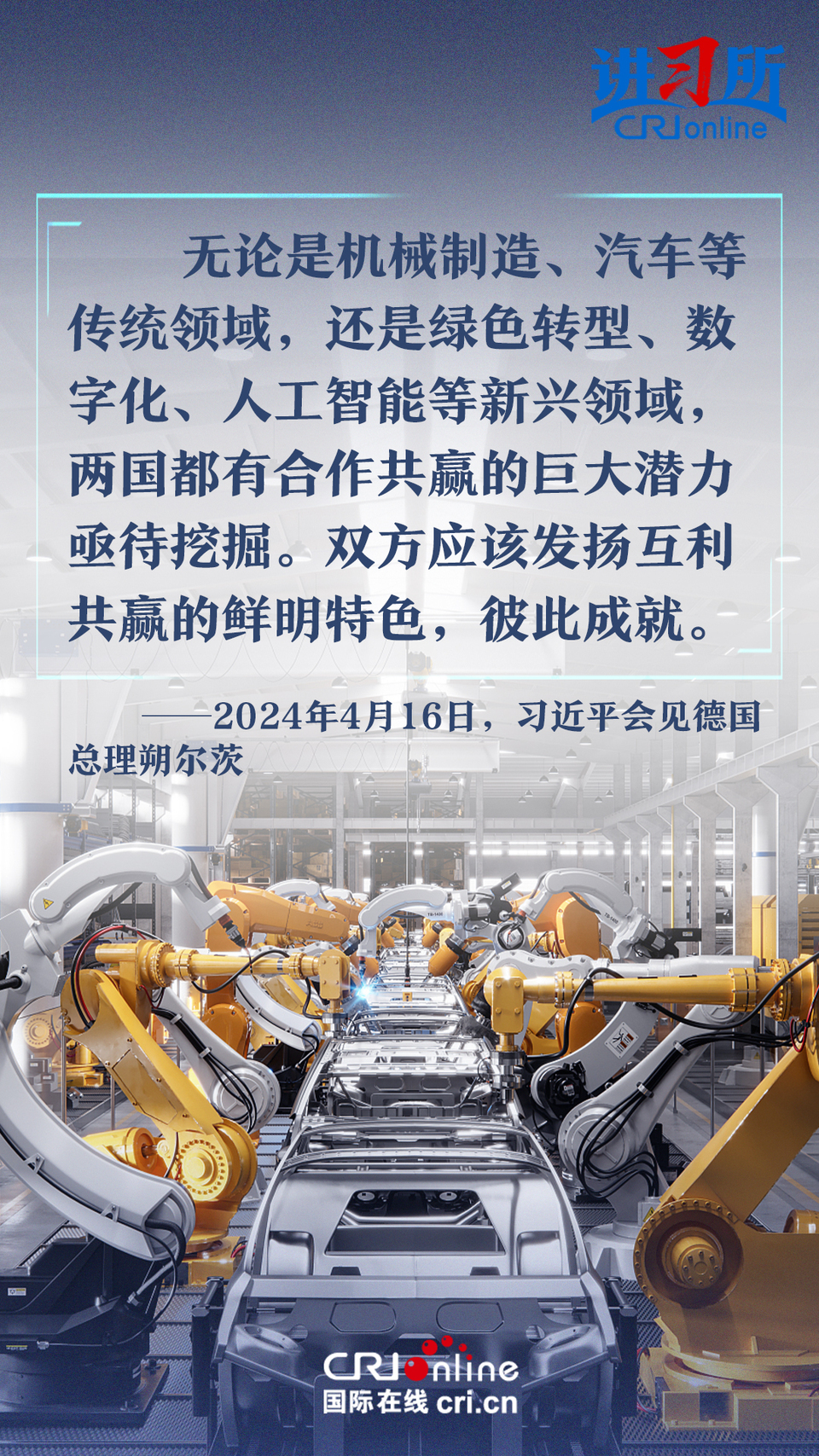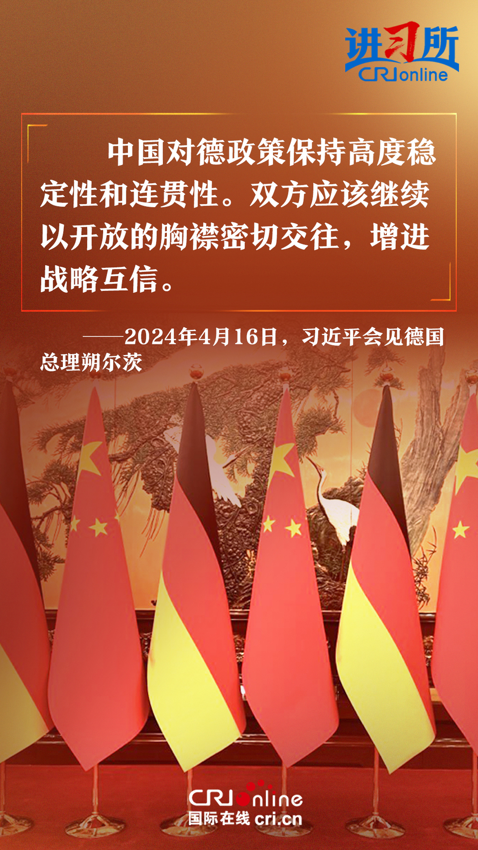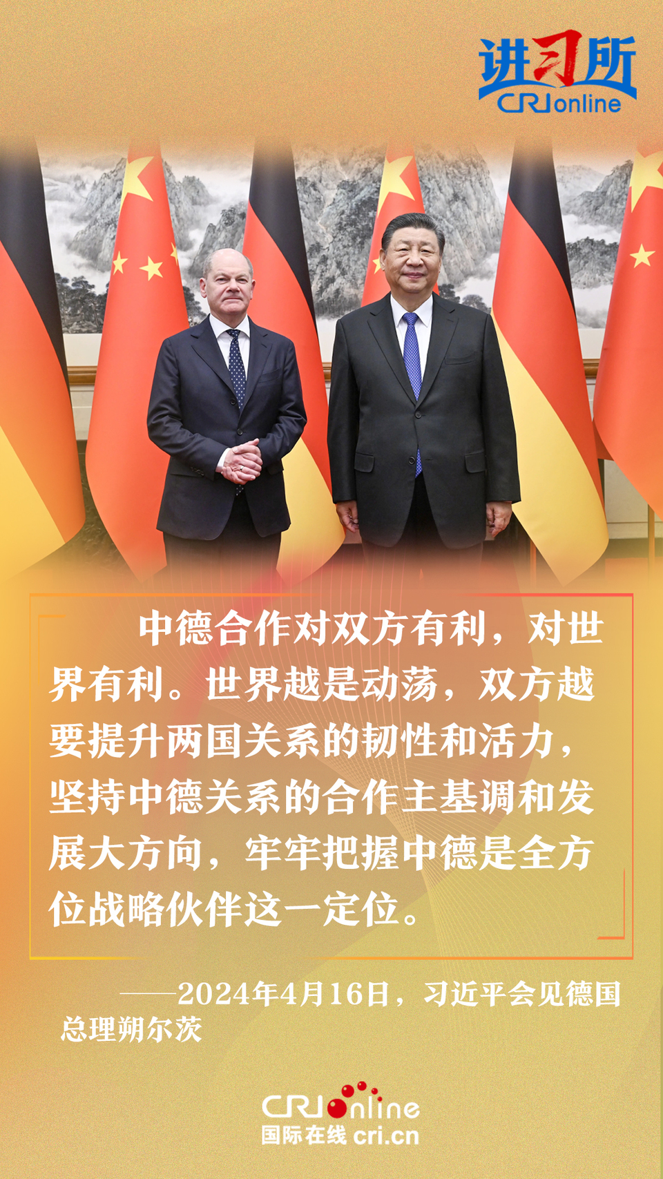4月16日上午,中国国家主席习近平在北京钓鱼台国宾馆会见了德国总理朔尔茨。习近平指出,中德合作对双方有利,对世界有利。世界越是动荡,双方越要提升两国关系的韧性和活力。中德是世界第二、第三大经济体,巩固和发展中德关系的意义超越双边关系范畴,对亚欧大陆乃至整个世界都有重要影响。两国要从长远和战略角度看待和发展双边关系,携手为世界注入更多稳定性和确定性。