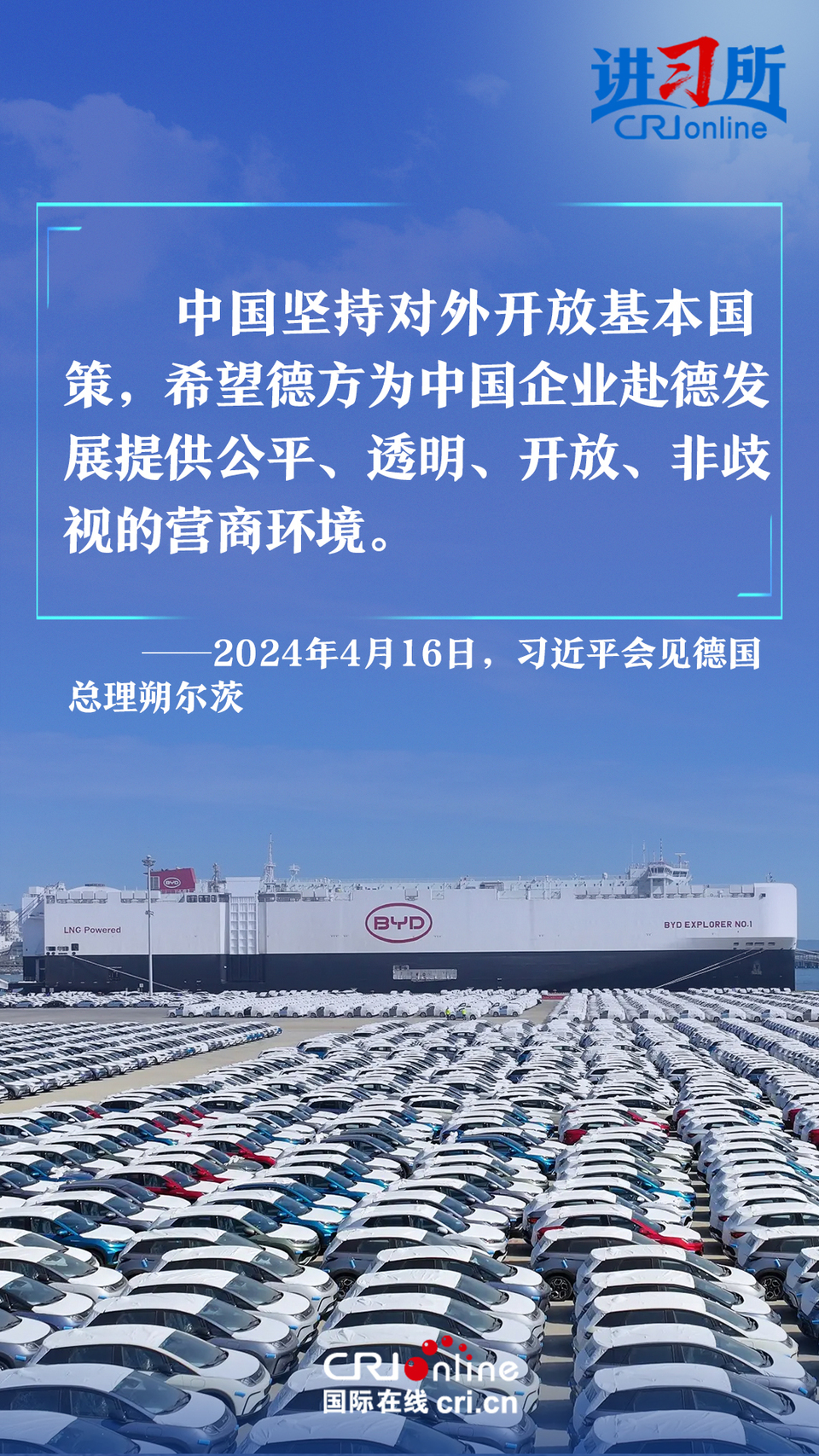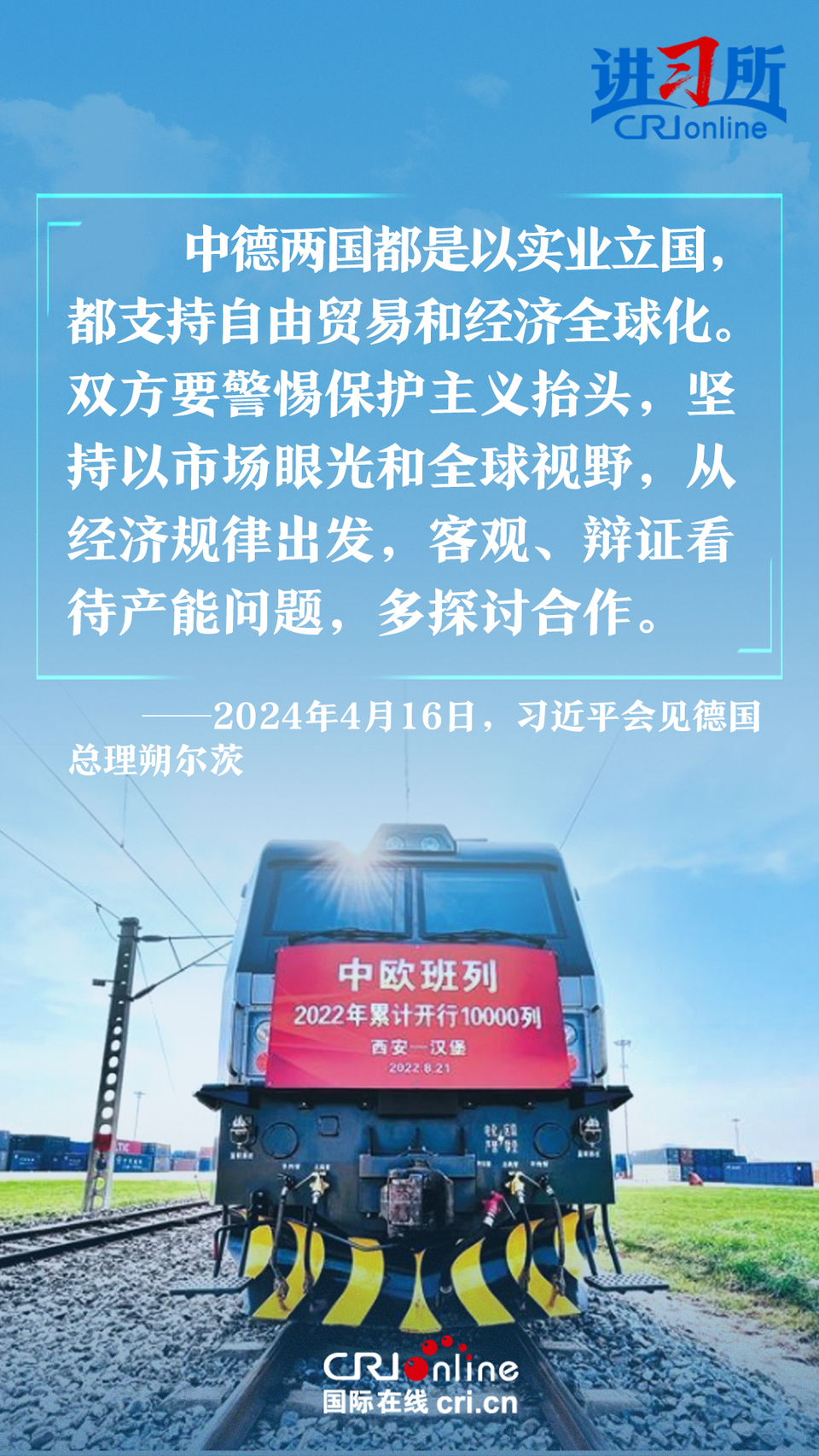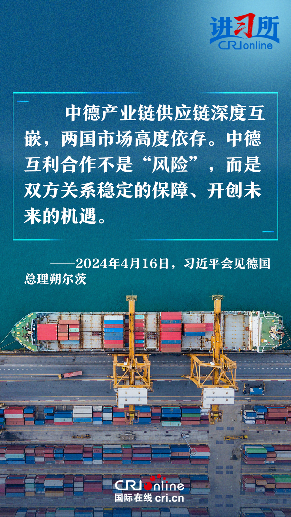 4月16日上午,中国国家主席习近平在北京钓鱼台国宾馆会见了德国总理朔尔茨。习近平指出,中德合作对双方有利,对世界有利。世界越是动荡,双方越要提升两国关系的韧性和活力。中德是世界第二、第三大经济体,巩固和发展中德关系的意义超越双边关系范畴,对亚欧大陆乃至整个世界都有重要影响。两国要从长远和战略角度看待和发展双边关系,携手为世界注入更多稳定性和确定性。