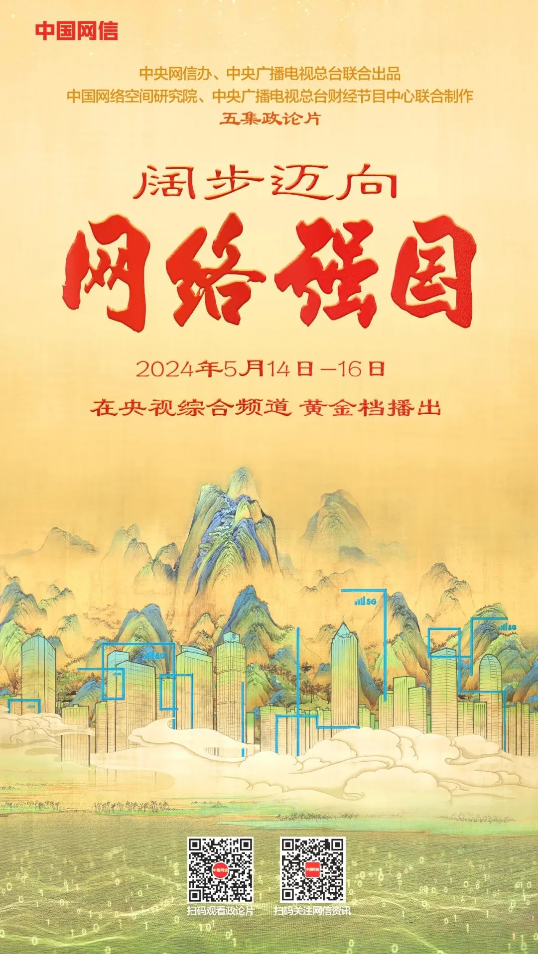 由中央网信办、中央广播电视总台联合出品,中国网络空间研究院、中央广播电视总台财经节目中心联合制作的政论片《阔步迈向网络强国》,将于5月14日至16日在央视综合频道黄金档首播,财经频道、中文国际频道和新闻频道黄金档重播,《中国网信》杂志相关融媒体平台同步推出。2024年是习近平总书记提出网络强国战略目标10周年,是我国全功能接入国际互联网30周年。《阔步迈向网络强国》旨在深入宣传阐释习近平新时代中国特色社会主义思想特别是习近平总书记关于网络强国的重要思想,进一步贯彻落实全国网络安全和信息化工作会议精神,全景展示党的十八大以来我国网信事业取得的历史性成就、发生的历史性变革,生动呈现新时代亿万人民共享互联网发展成果的幸福美好生活和良好精神风貌。