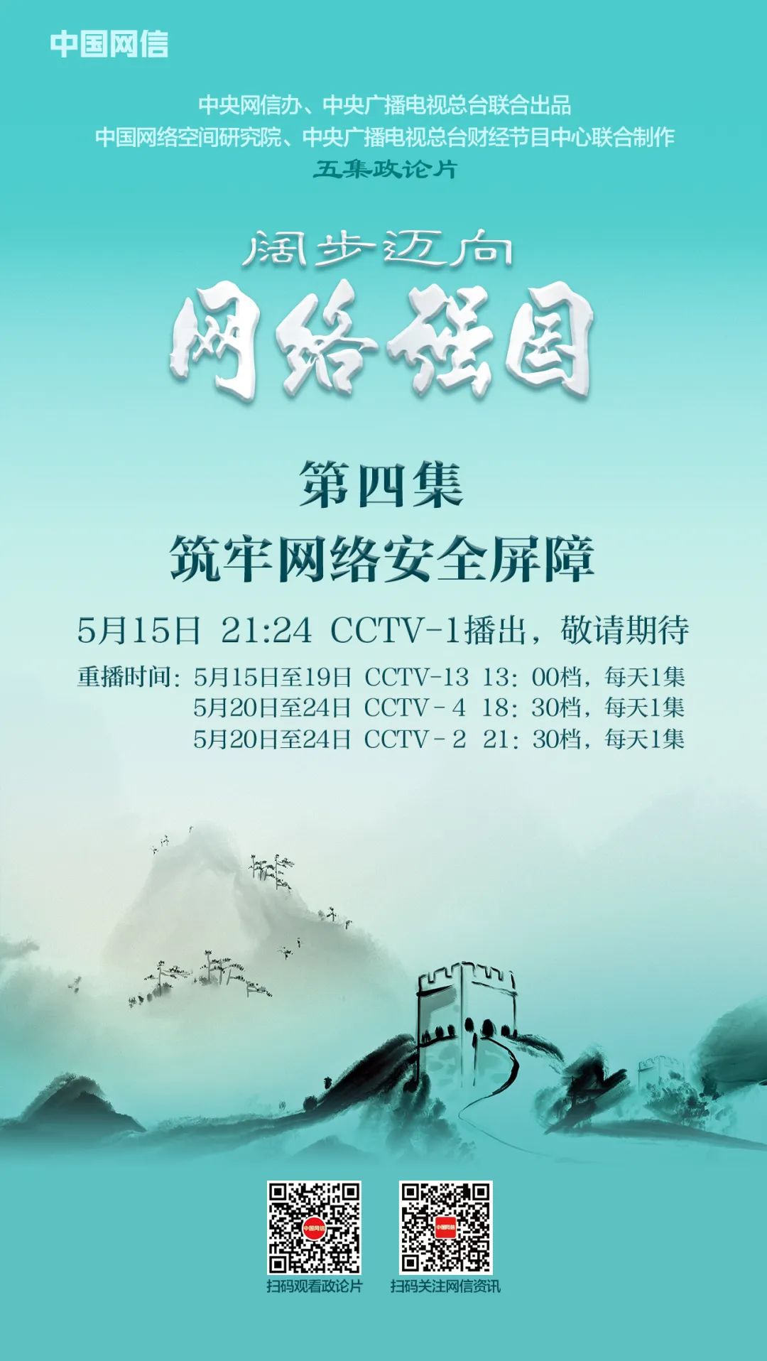 由中央网信办、中央广播电视总台联合出品,中国网络空间研究院、中央广播电视总台财经节目中心联合制作的政论片《阔步迈向网络强国》,于5月14日至16日在央视综合频道黄金档首播,财经频道、中文国际频道和新闻频道黄金档重播,《中国网信》杂志相关融媒体平台同步推出。