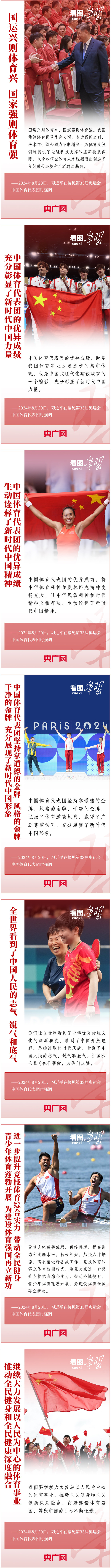 “祖国和人民为你们骄傲,为你们点赞。”8月20日,习近平总书记在人民大会堂接见第33届奥运会中国体育代表团并发表重要讲话。总书记高度肯定中国体育代表团取得的优异成绩,赞扬他们充分彰显了新时代中国力量、生动诠释了新时代中国精神、充分展现了新时代中国形象,勉励大家戒骄戒躁、再接再厉,为建设体育强国再立新功。一起来学习!