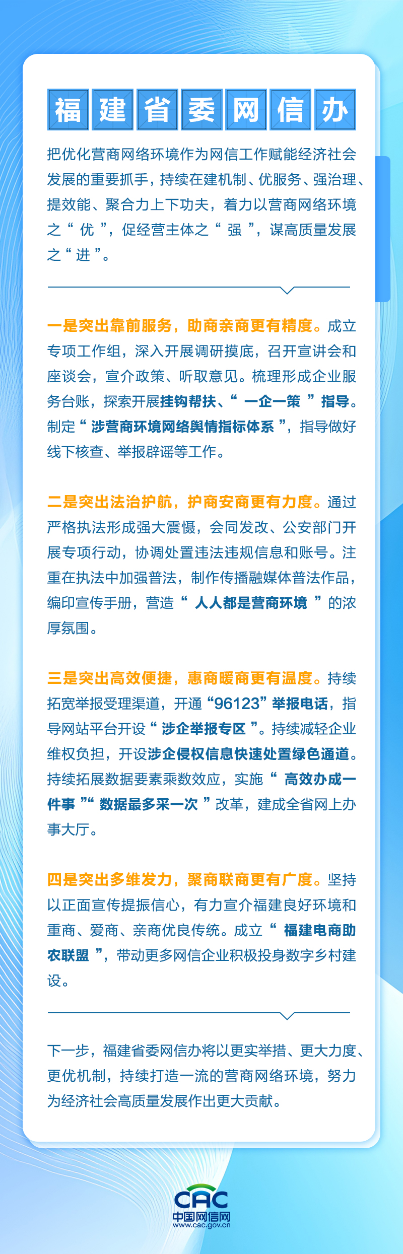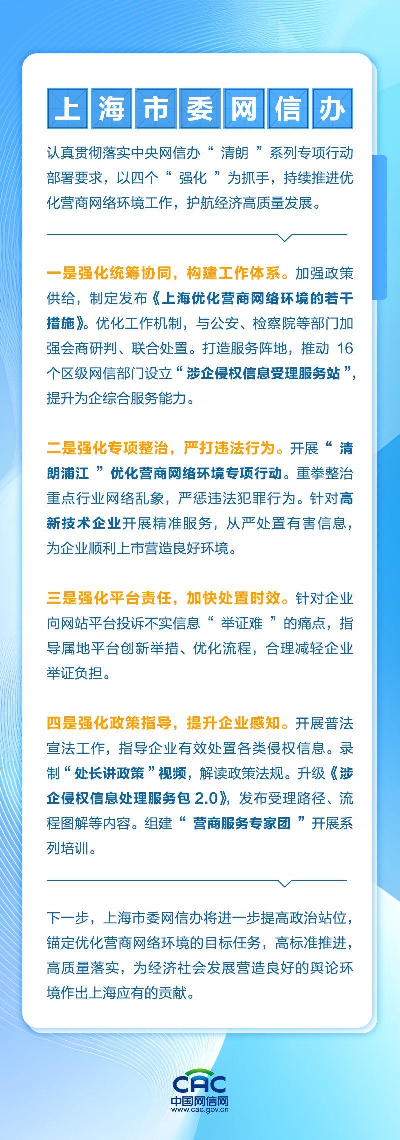优化营商网络环境是优化营商环境的重要内容,也是网信部门的重要职责。近日,中央网信办在北京召开优化营商网络环境工作经验总结交流会。围绕优化营商网络环境工作,北京、上海、福建、四川等地网信办,以及微博、腾讯、抖音等平台,探索形成了一批好经验好做法。现将有关发言摘编如下,以供交流。