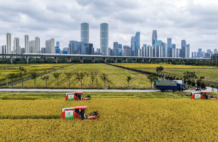 收割机在位于浙江杭州萧山区世纪田园粮食功能区的稻田里收割水稻,远处高铁列车飞驰而过(2025年10月21日摄,无人机照片)。新华社记者 徐昱 摄
