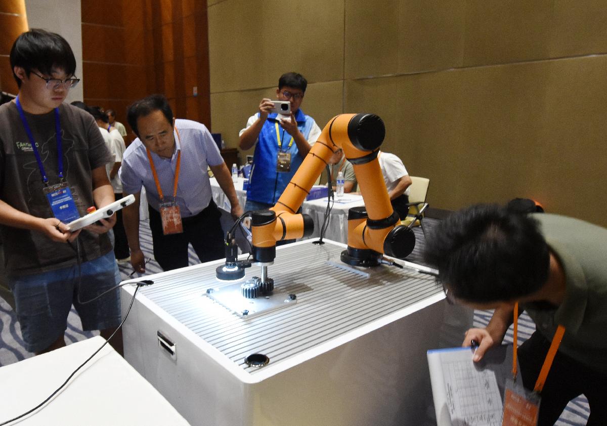 △ 2025年中国大学生机械工程创新创意大赛智能精密装配赛京津冀鲁联赛现场,评委对参赛选手进行实操调试评比。