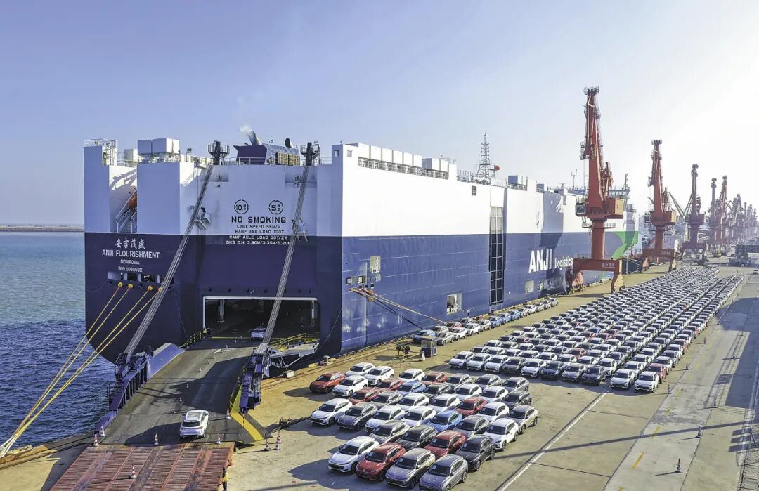 江苏连云港,滚装船正在装运出口新能源汽车等。王健民 摄