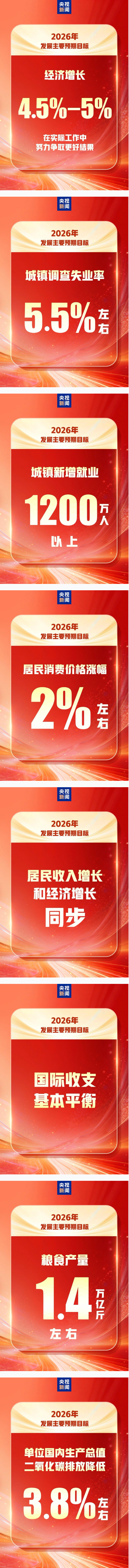 十四届全国人大四次会议5日上午在人民大会堂开幕,习近平等党和国家领导人出席开幕会,国务院总理李强向大会作政府工作报告。一组图速览2026年发展主要预期目标。