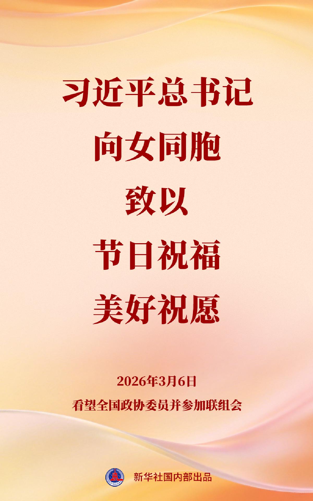 在“三八”国际劳动妇女节即将到来之际,习近平代表中共中央,向参加全国两会的女代表、女委员、女工作人员,向全国各族各界妇女,向香港特别行政区、澳门特别行政区、台湾地区的女同胞和海外女侨胞,致以节日祝福和美好祝愿。