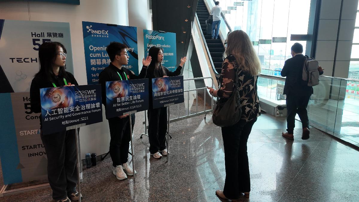 4月14日,2026年世界互联网大会亚太峰会现场,志愿者正在为参会嘉宾指引路线。中国网信网柴于涵摄。