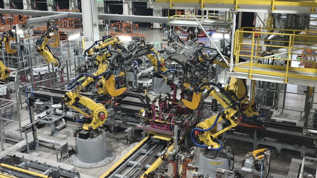 图为常州一新能源汽车智能制造基地焊装车间,机械臂正在作业。中国网信网米江晅摄。